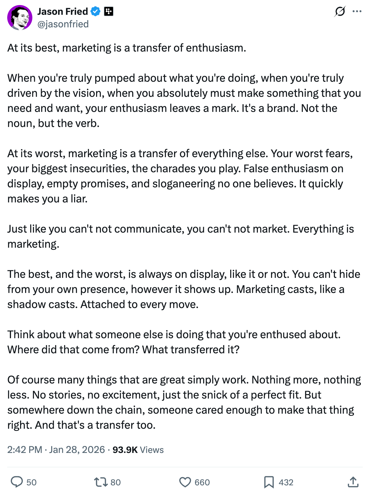 Consider the following, something Jason Fried wrote about marketing. Set aside the focus on marketing and, instead, understand what he wrote as being about communication: