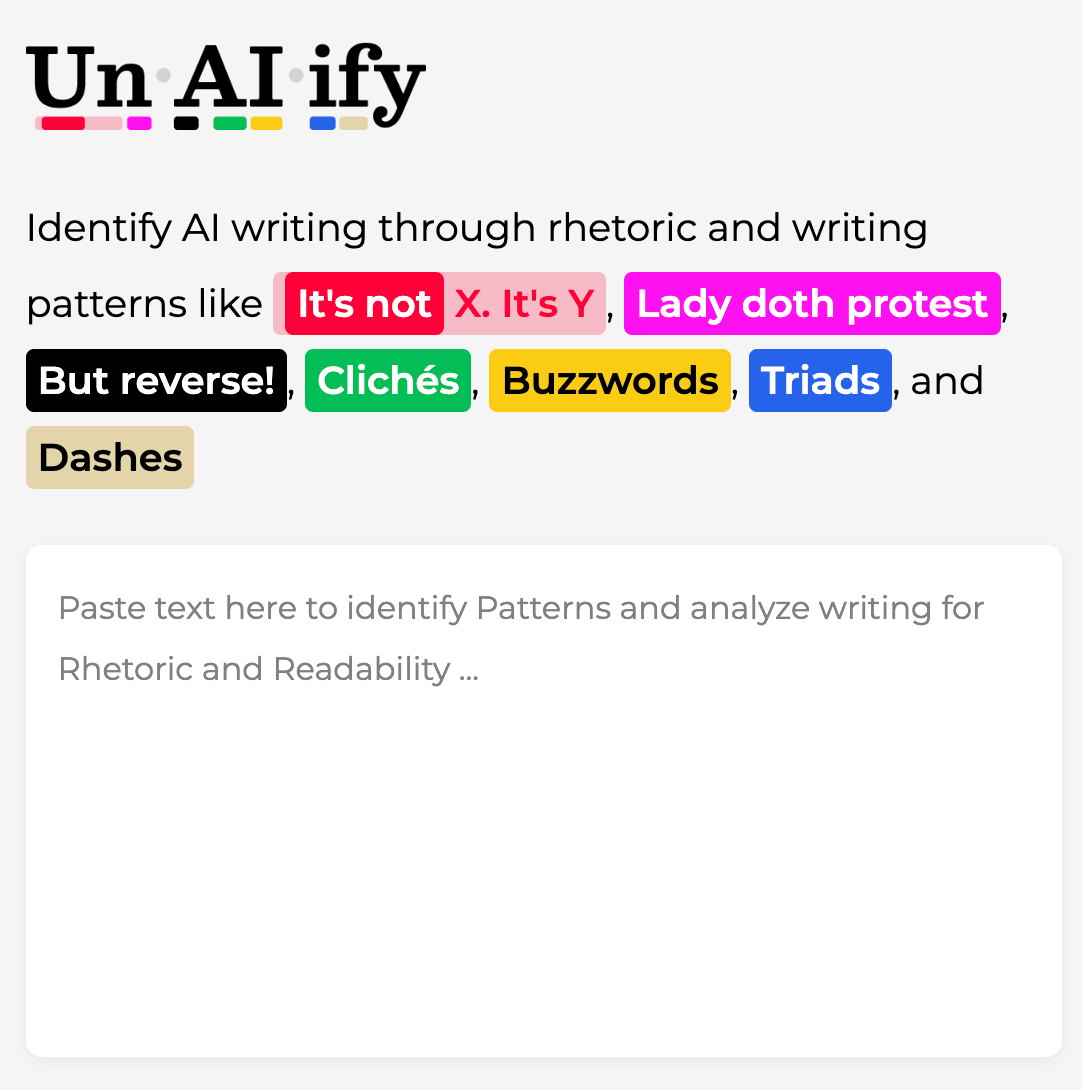 Un•AI•ify, as of this writing, anchors on highlighting a handful of writing patterns, “clues” of AI writing: “It’s not X. It’s Y,” “Lady doth protest,” “But reverse!,” “Clichés,” “Buzzwords,” and even the beloved (now maligned) em dash.